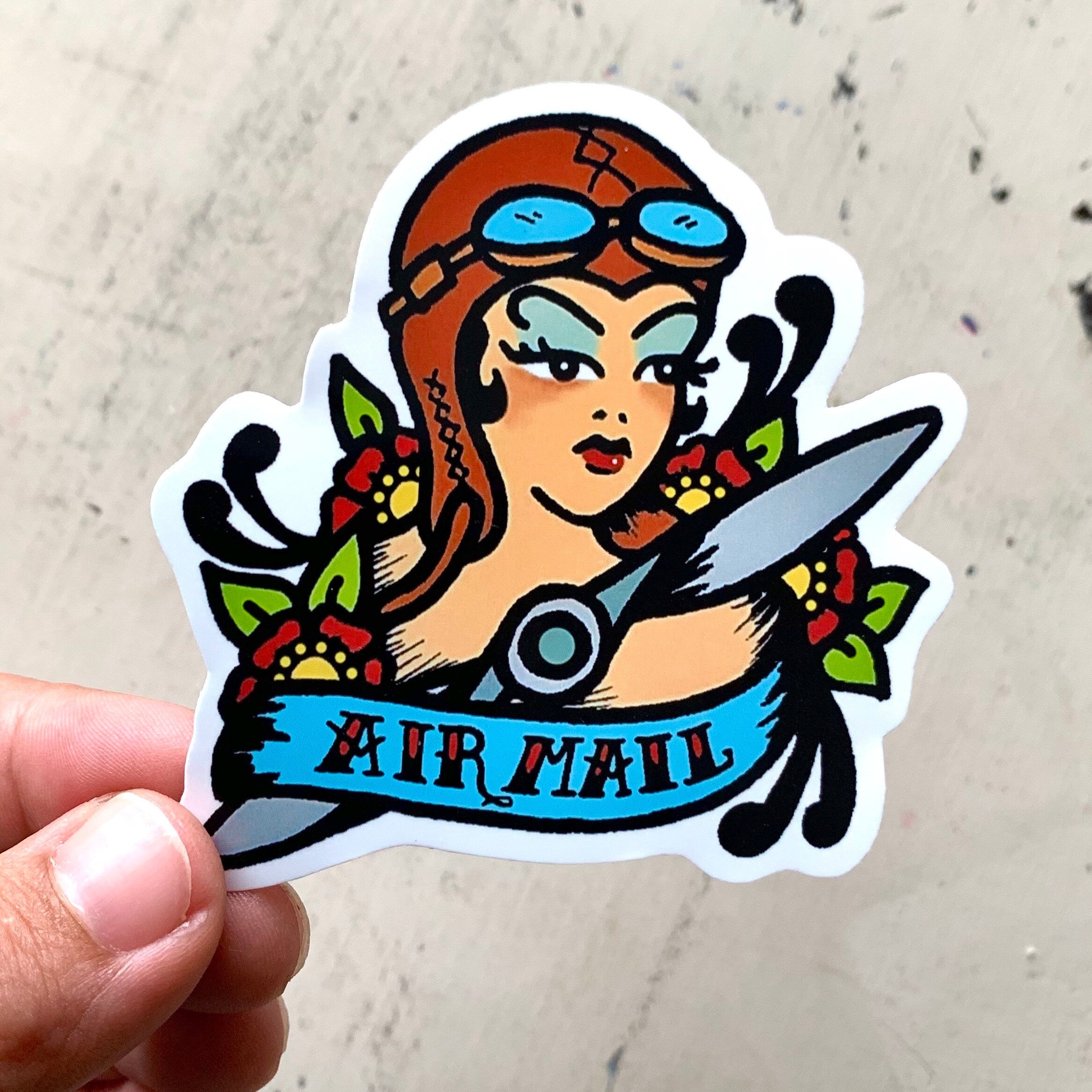 *5 aviator beauty stickers, complete with a plane propeller and a banner that states "AIRMAIL"