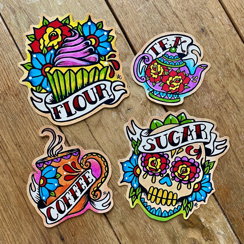 PLEASE NOTE: These are handmade stickers and not mass produced. They are not intended for outdoor use on a window or vehicle. Heavy exposure to the elements and to strong sunlight is not advised as this will eventually fade the colors and cause the sticker to peel. These stickers have been created for use on kitchen jars and canisters (glass, wood, or ceramic), and can handle light handwashing.