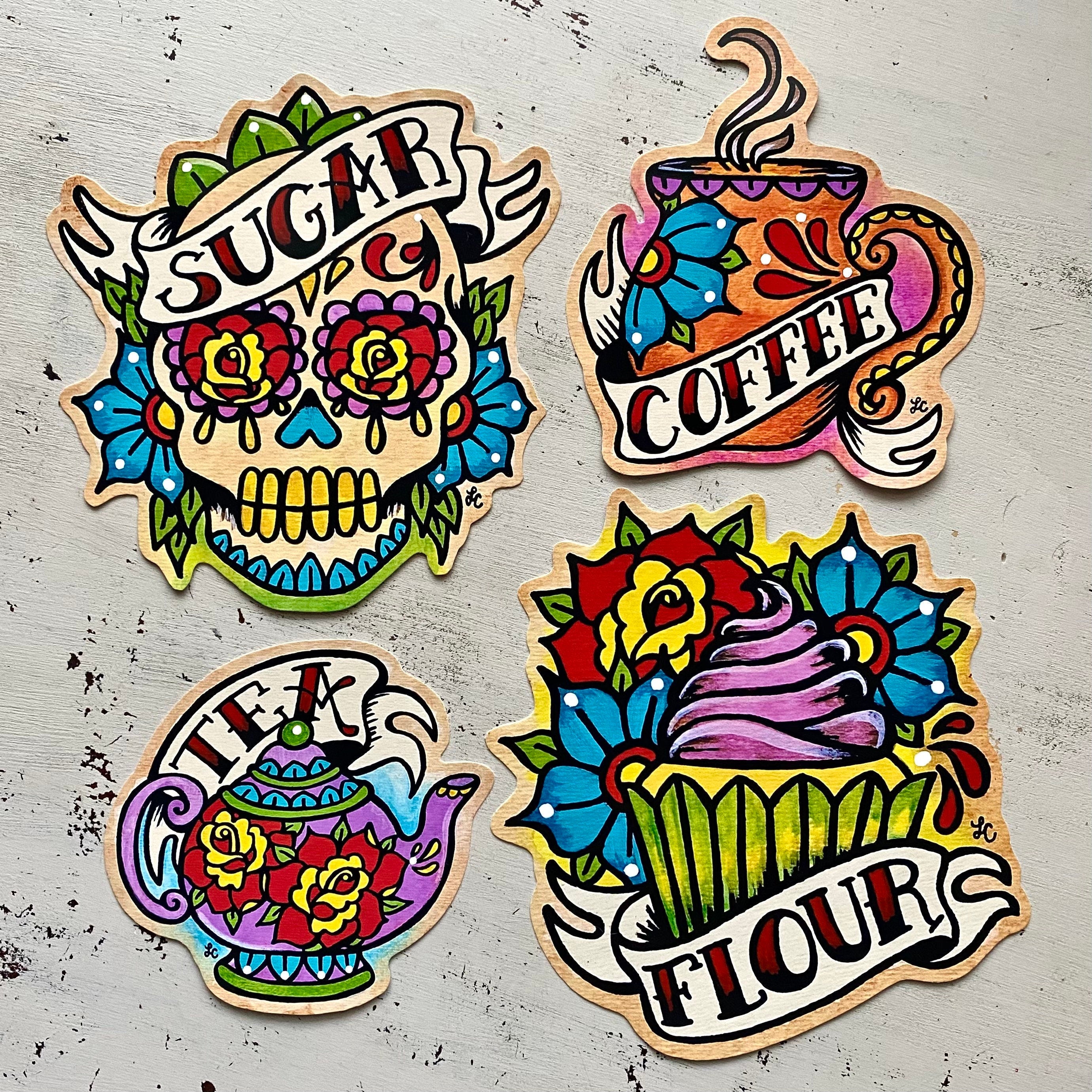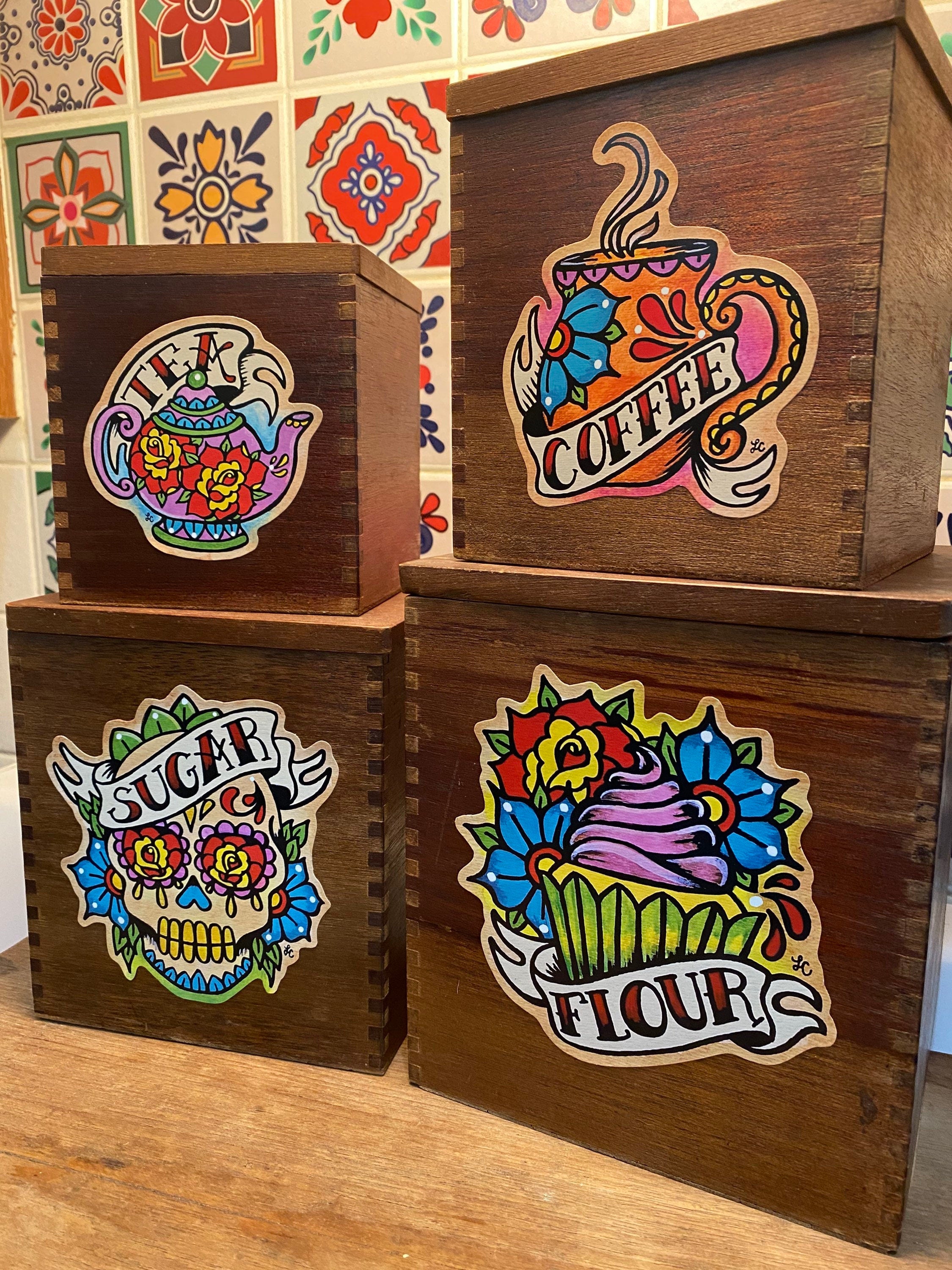 This sticker decal set features my original art to label canisters and assist with kitchen organization, while bringing vibrant color to your decor! You will receive 4 stickers total, in assorted sizes. (This does not include the canisters pictured). You will receive one decal each of "Flour" (5.25” x 5”), “Sugar" (5” x 5”), "Coffee" (4.5” x 4”), and "Tea" (3.5” x 3.5”). They are printed on vinyl paper and finished with a protective sealant. Each art sticker is hand cut and vibrant. If you need a custom size, no problem! Send me a message and let me know what you would like.