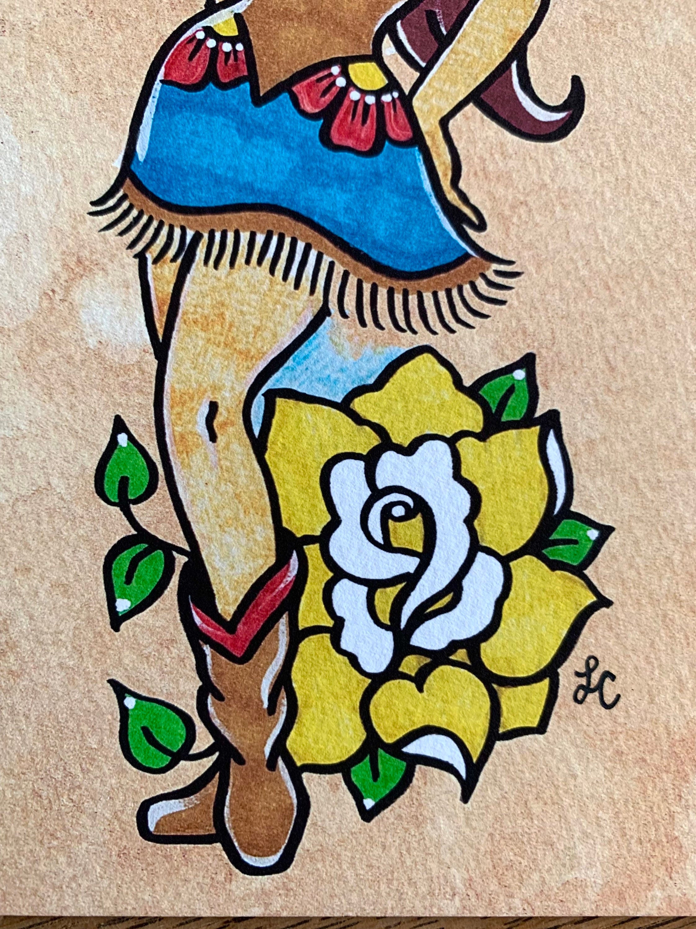 This is a reproduction of my original, cowgirl pinup art. You can choose a print that measures 5" x 7", 8" x 10", or 11" x 14". Signed on the back by the artist, and ready to slip into a standard sized frame! The watermark logo will not appear on your print.