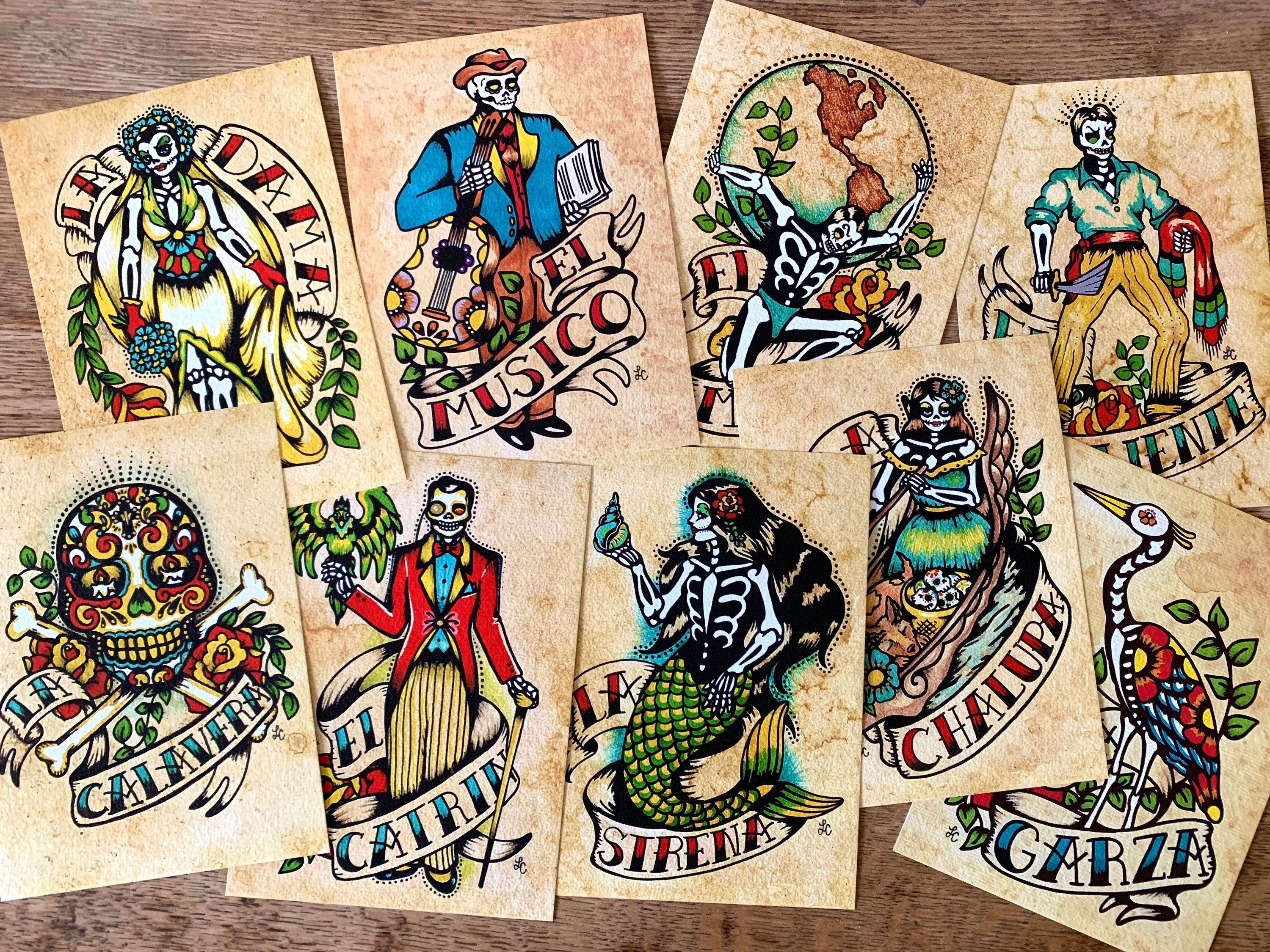 This set of nine individual prints was inspired by Mexican Loteria cards and "Dia de los Muertos".