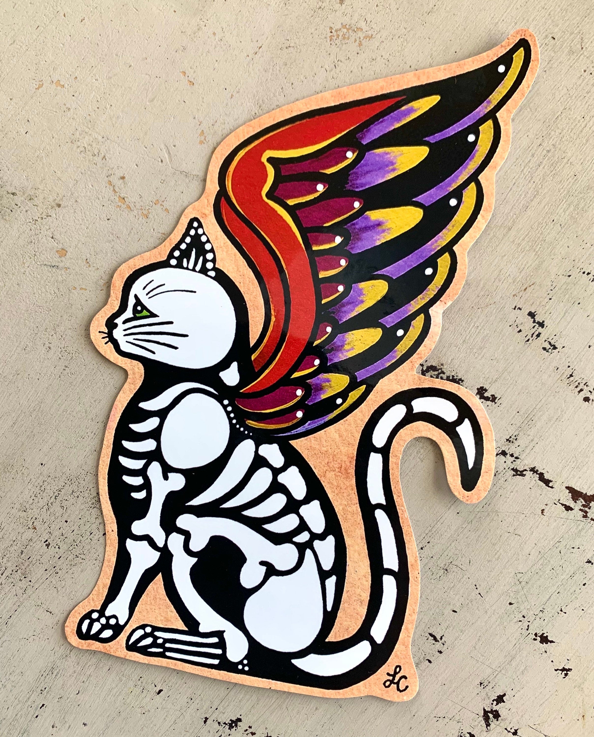 This sticker decal features my original art of a Day of the Dead cat with vibrant wings. It measures 3" x 5". Printed on vinyl paper and finished with a protective sealant. Each art sticker is hand cut and vibrant.