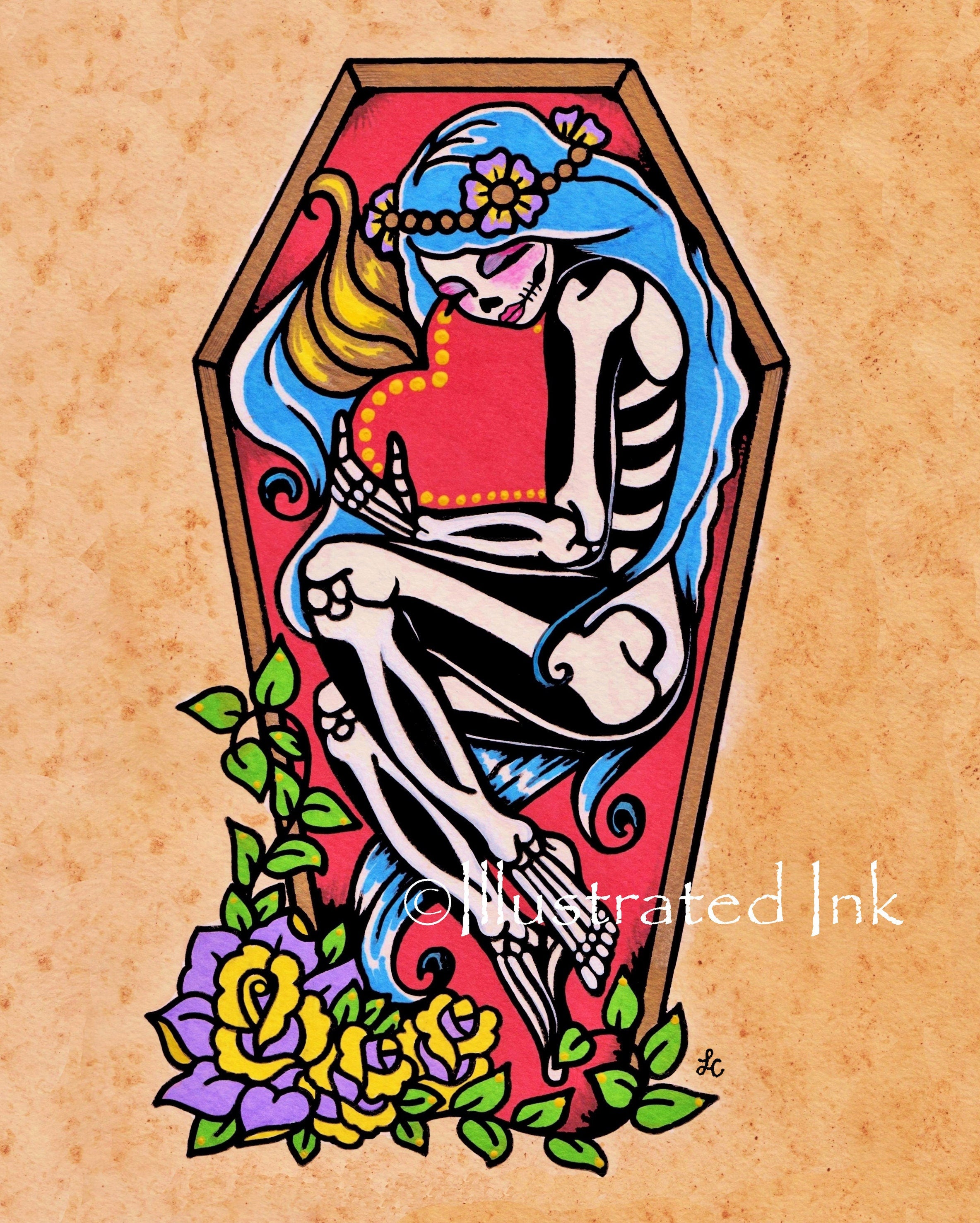 "I'll Never Let Go" - This skeletal beauty is holding on to her love. This illustration is inspired by Day of the Dead and traditional tattoo design.