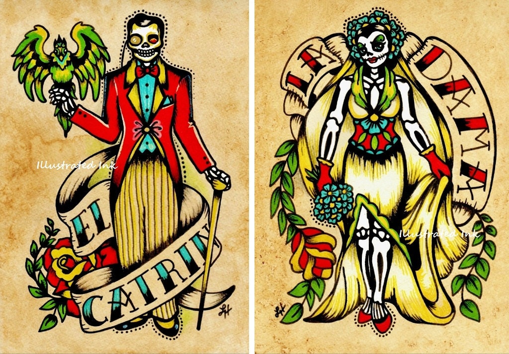 This set of prints was inspired by the Mexican Loteria cards, "La Dama" & "El Catrin". I've given this dapper couple a Day of the Dead makeover, with an old school tattoo influence.