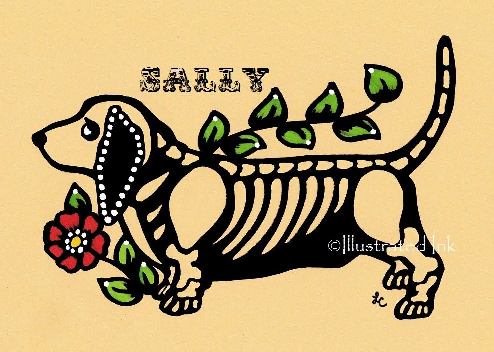 I created this sweet skele-basset print, specifically for a beloved dog's altar or for those that just love "Dia de los Muertos".