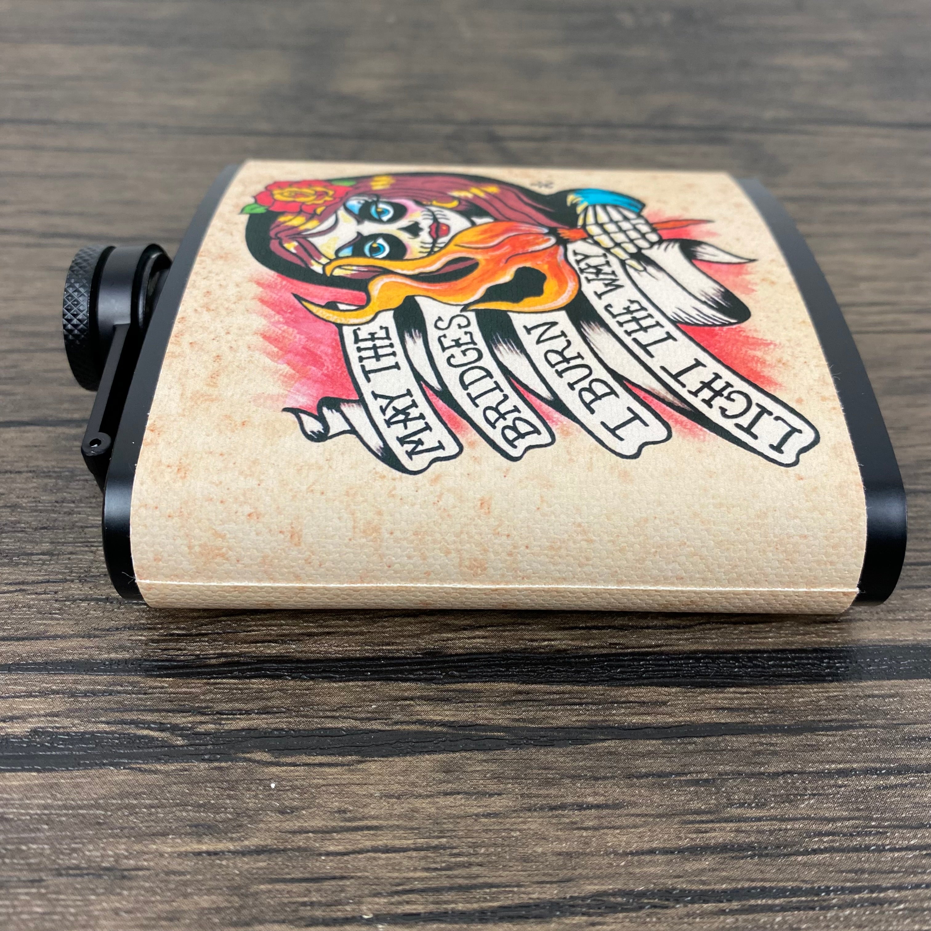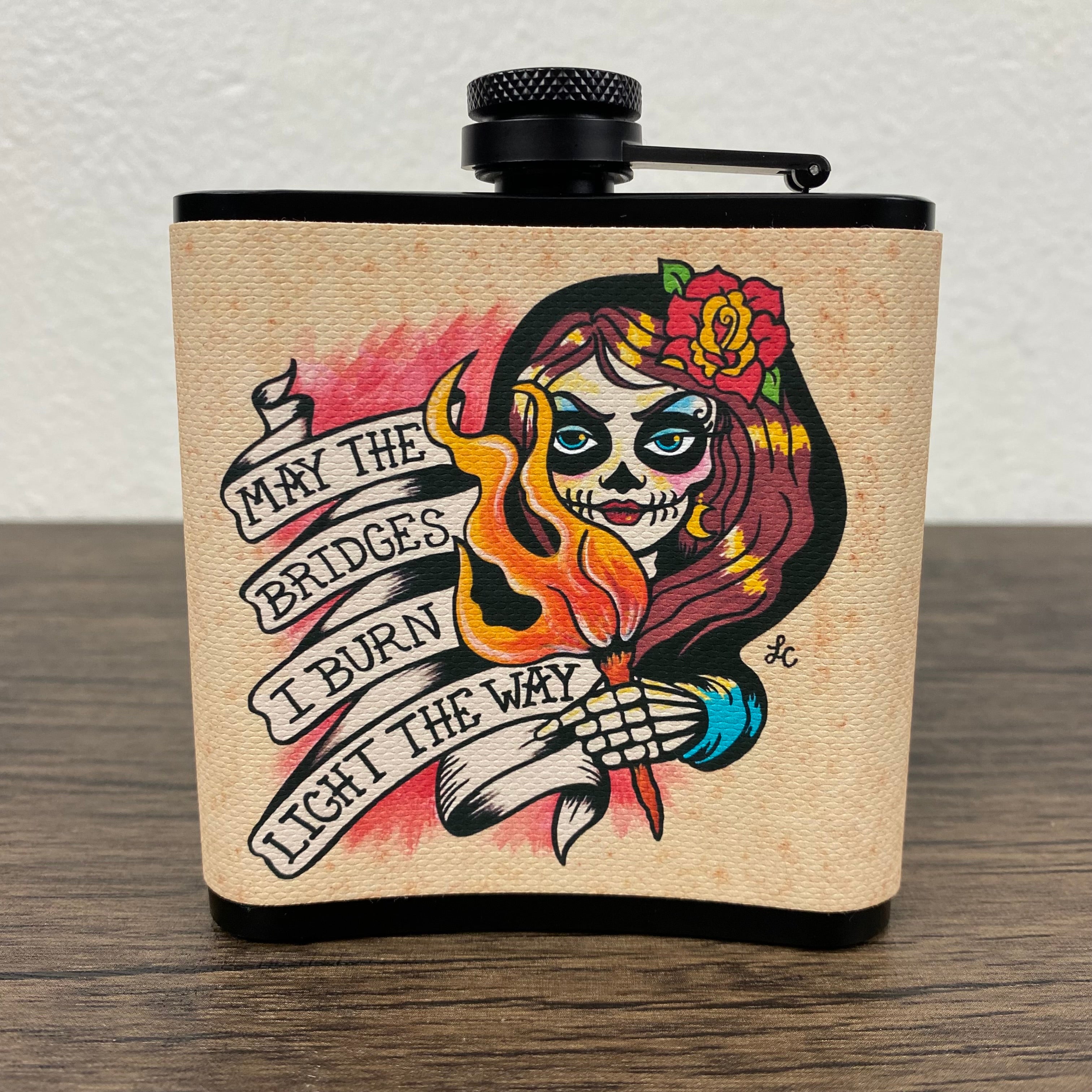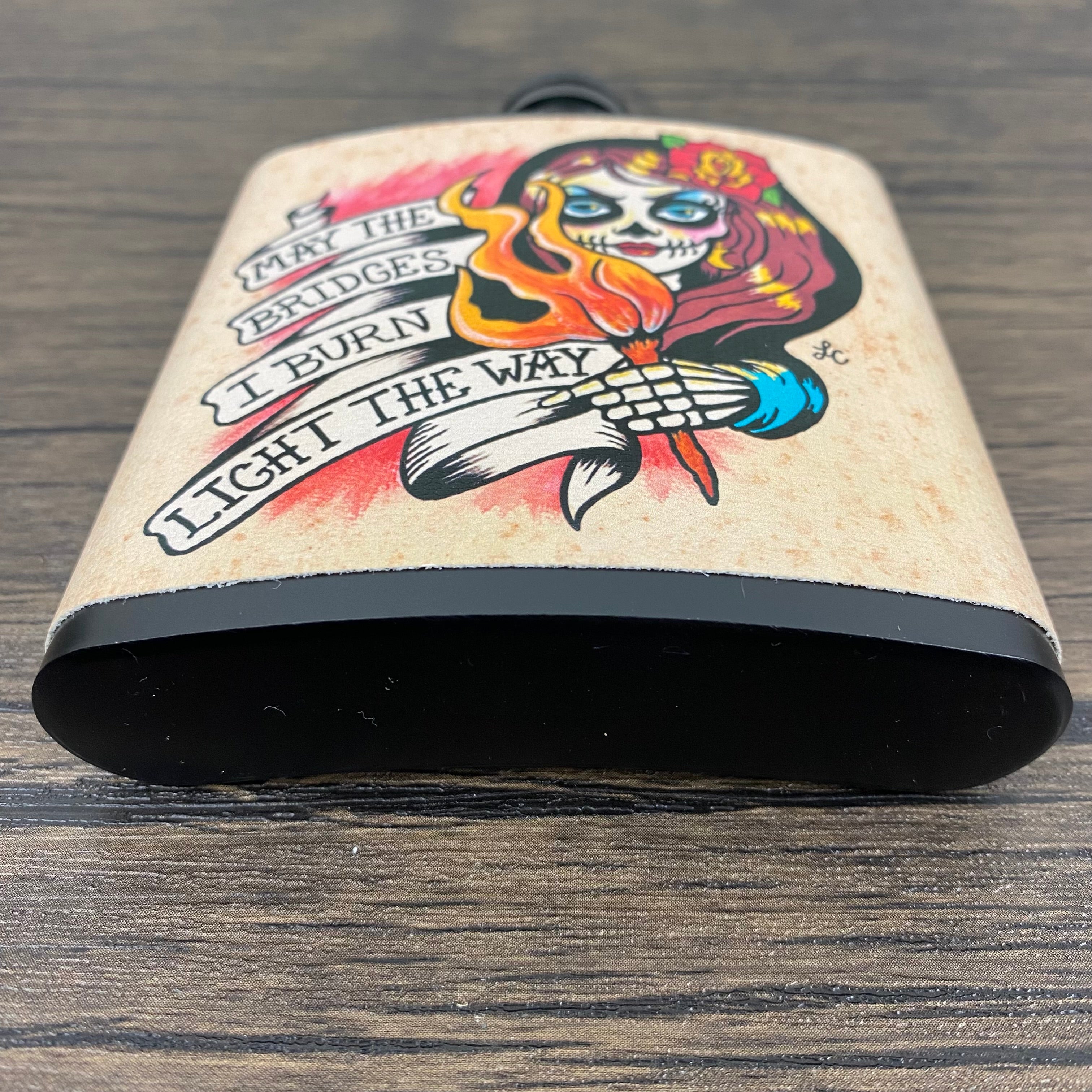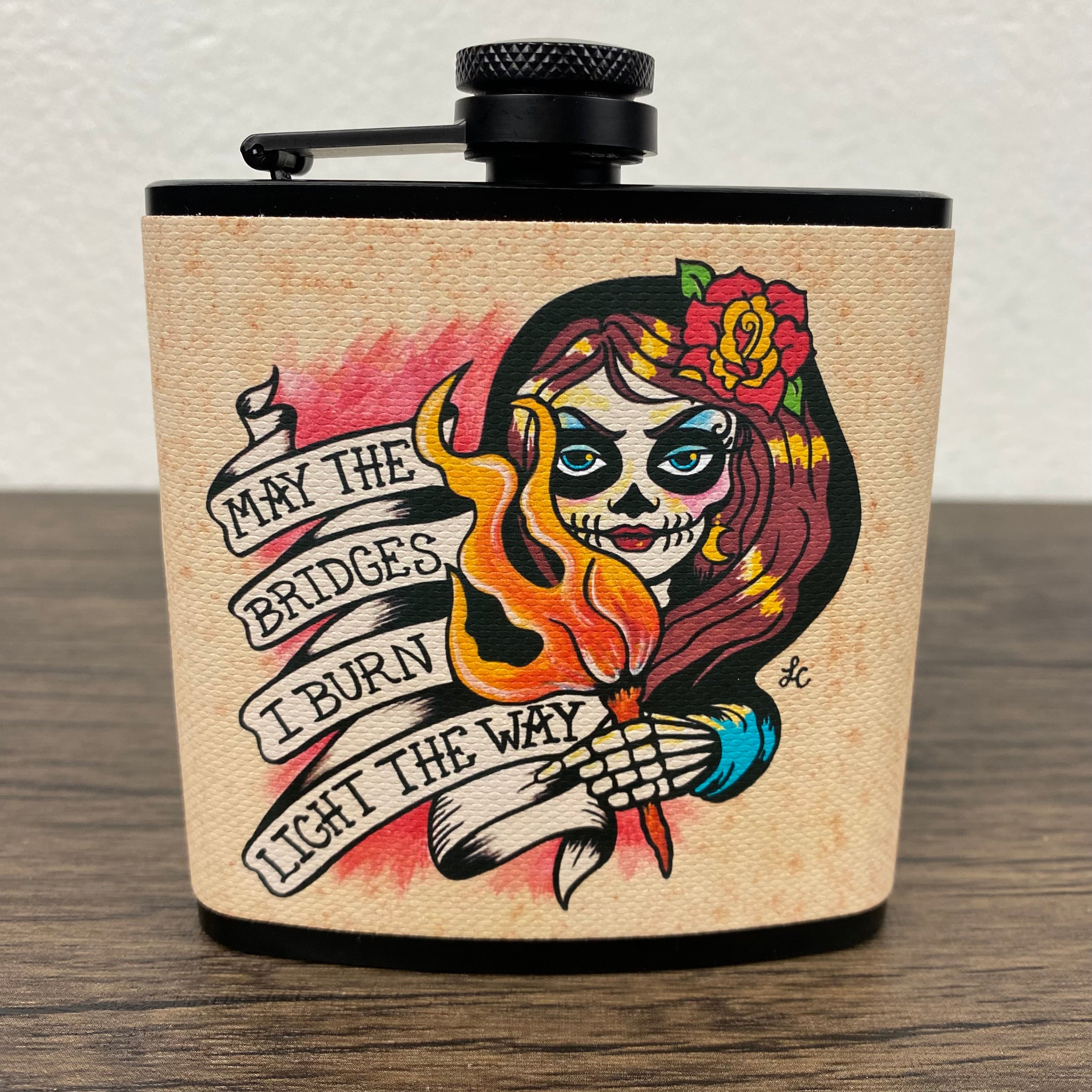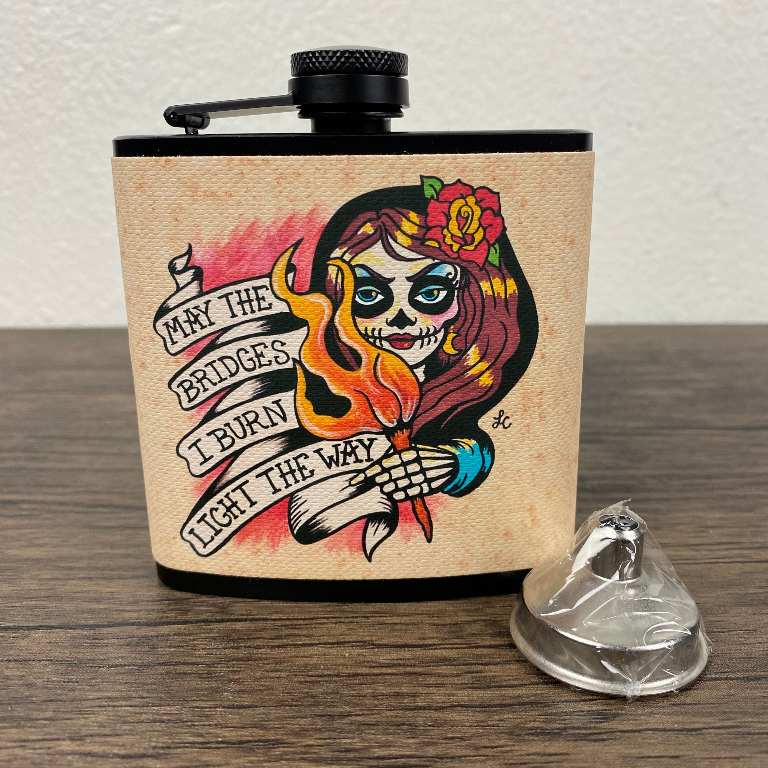 This Day of the Dead flask features my original artwork of a skeletal beauty holding a torch. She states “May the bridges I burn light the way”. The design is on a canvas wrap and sealed for water/liquid protection. This stainless steel flask holds 6 ounces and comes with a metal funnel.