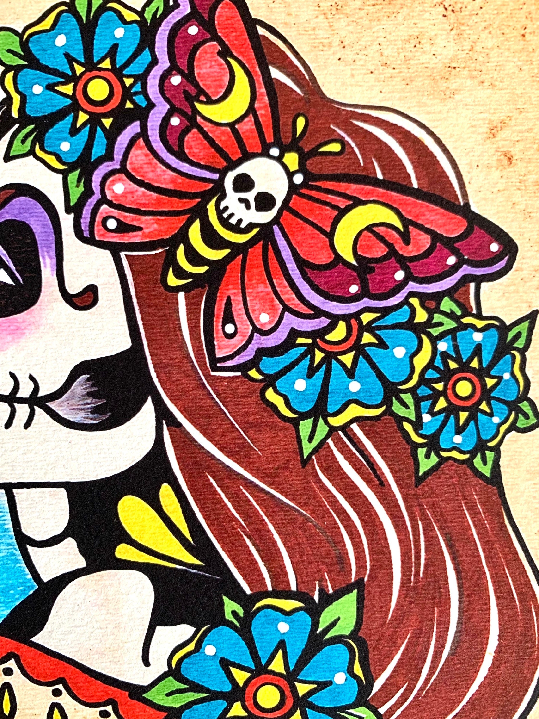 This sugar skull beauty wears a floral garland of a death moth and flowers. She was inspired by Day of the Dead, American traditional tattoo design, and Mexican folk art.