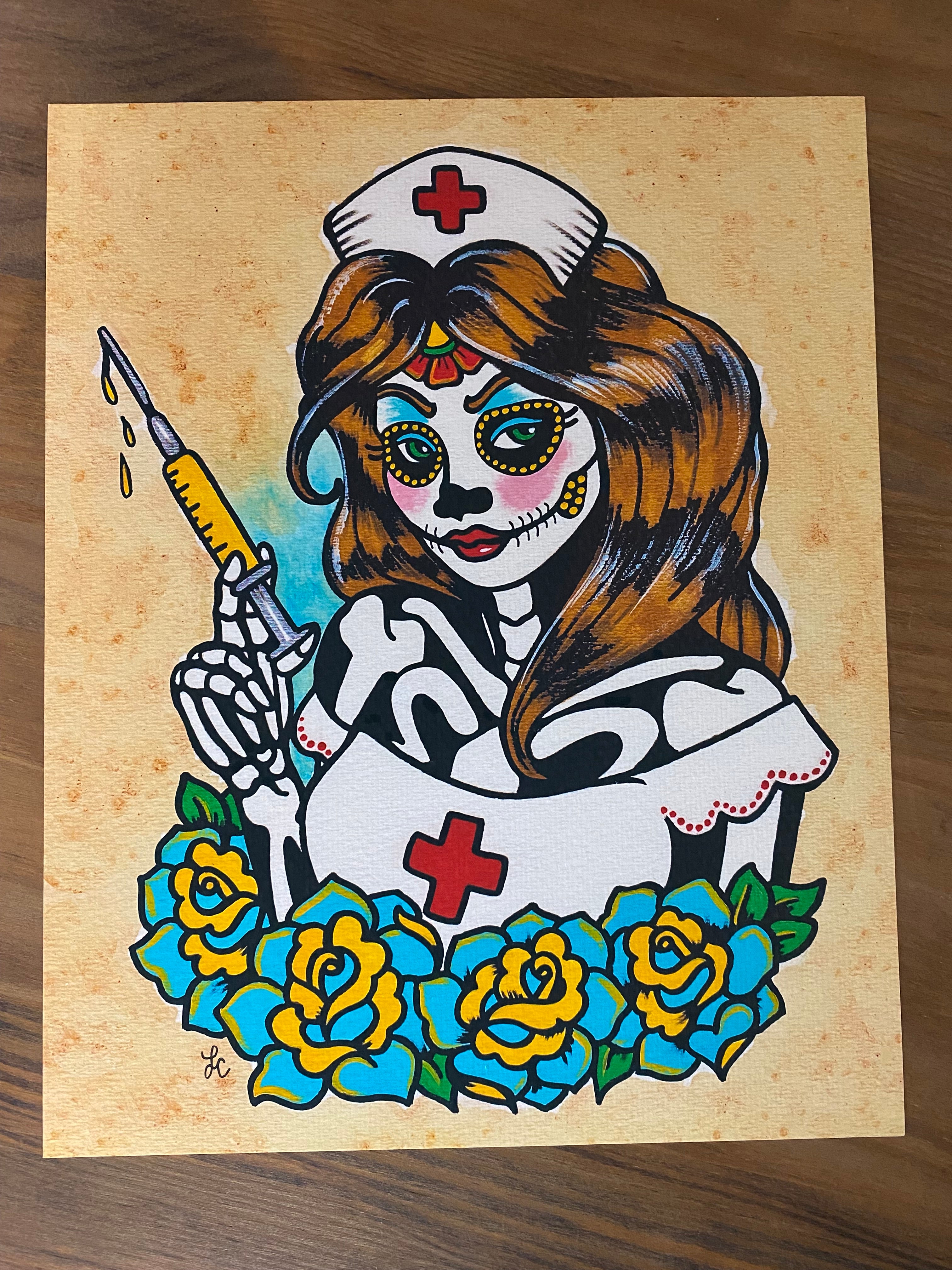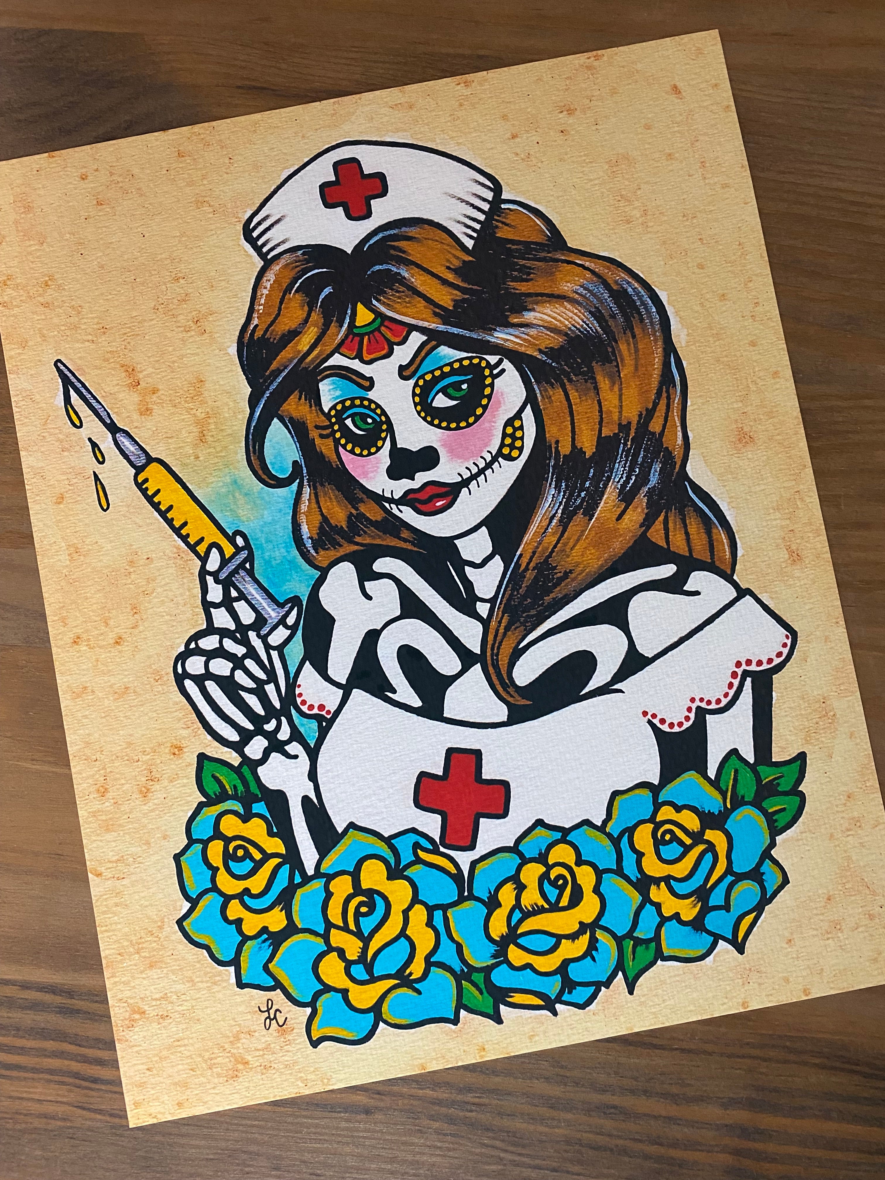 Day of the Dead Nurse inspired by old school tattoo design and Mexican folk art. First in my "careers" series! This print would be a lovely addition to any "Dia de los Muertos" collection or would make for a unique gift.