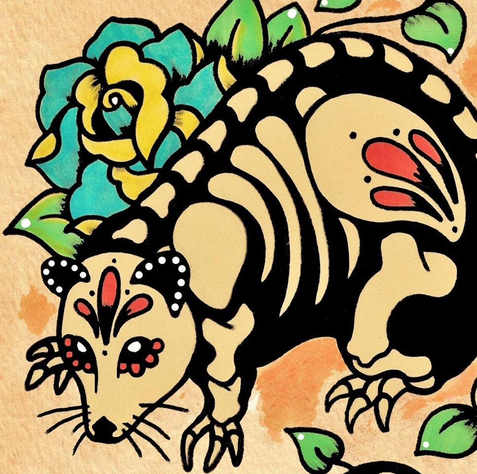 This Day of the Dead possum was inspired by a mix of Mexican folk art and old school tattoo design. In Central America and parts of South America, the opossum is portrayed in mythology and folk lore. Opossum occasionally plays the role of a trickster or an animal hero who escapes from danger by using his wits. My favorite myth, is his role as the "fire-bringer", where he brings fire from the gods to man (supposedly opossums have no hair on their tails, because fire singed it off long ago).