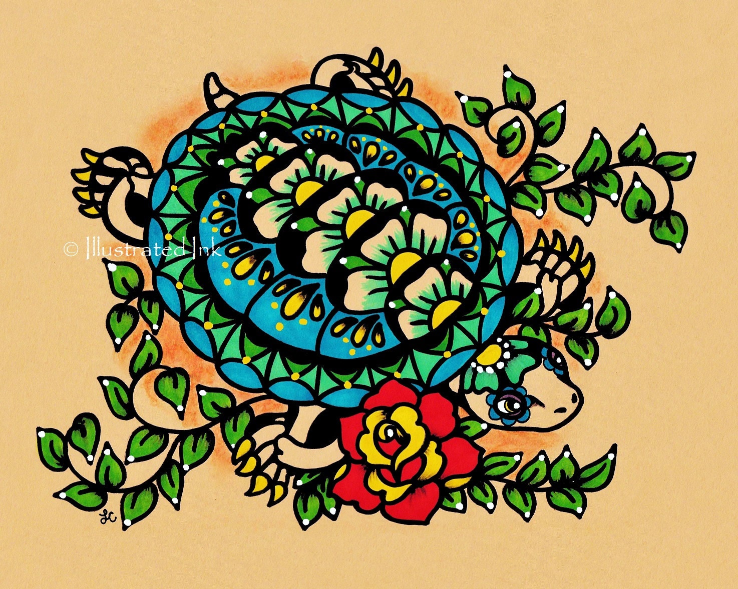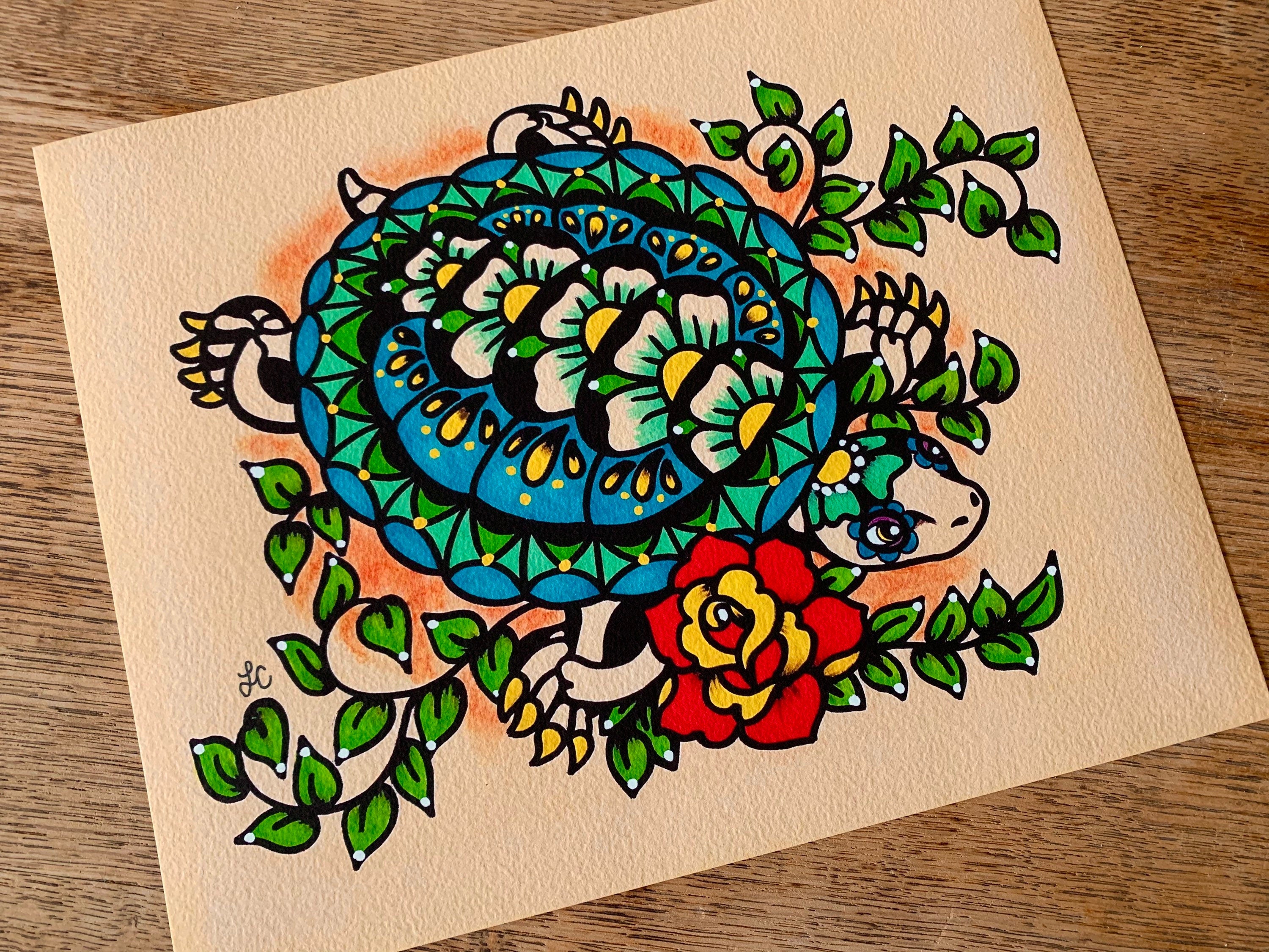 This Day of the Dead turtle was inspired by a mix of Mexican folk art and old school tattoo design.