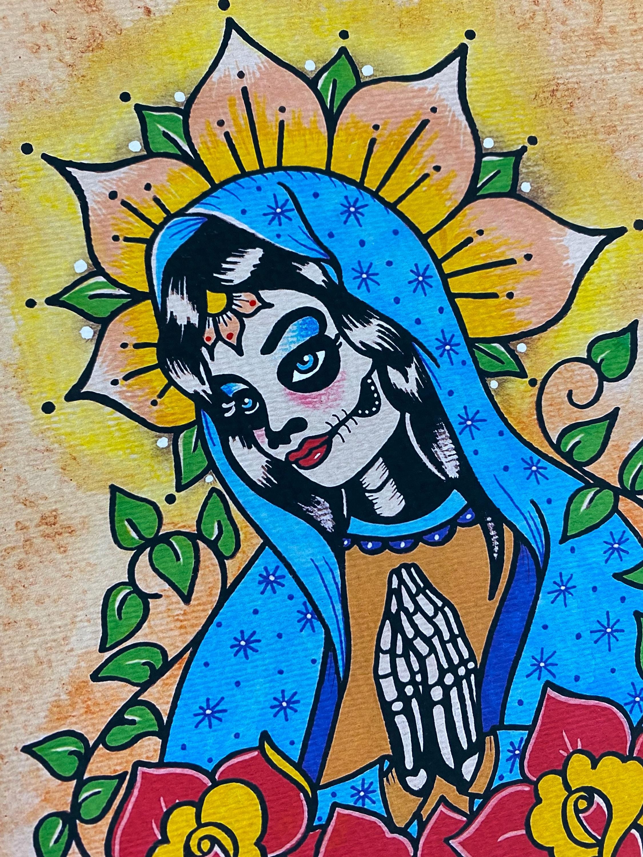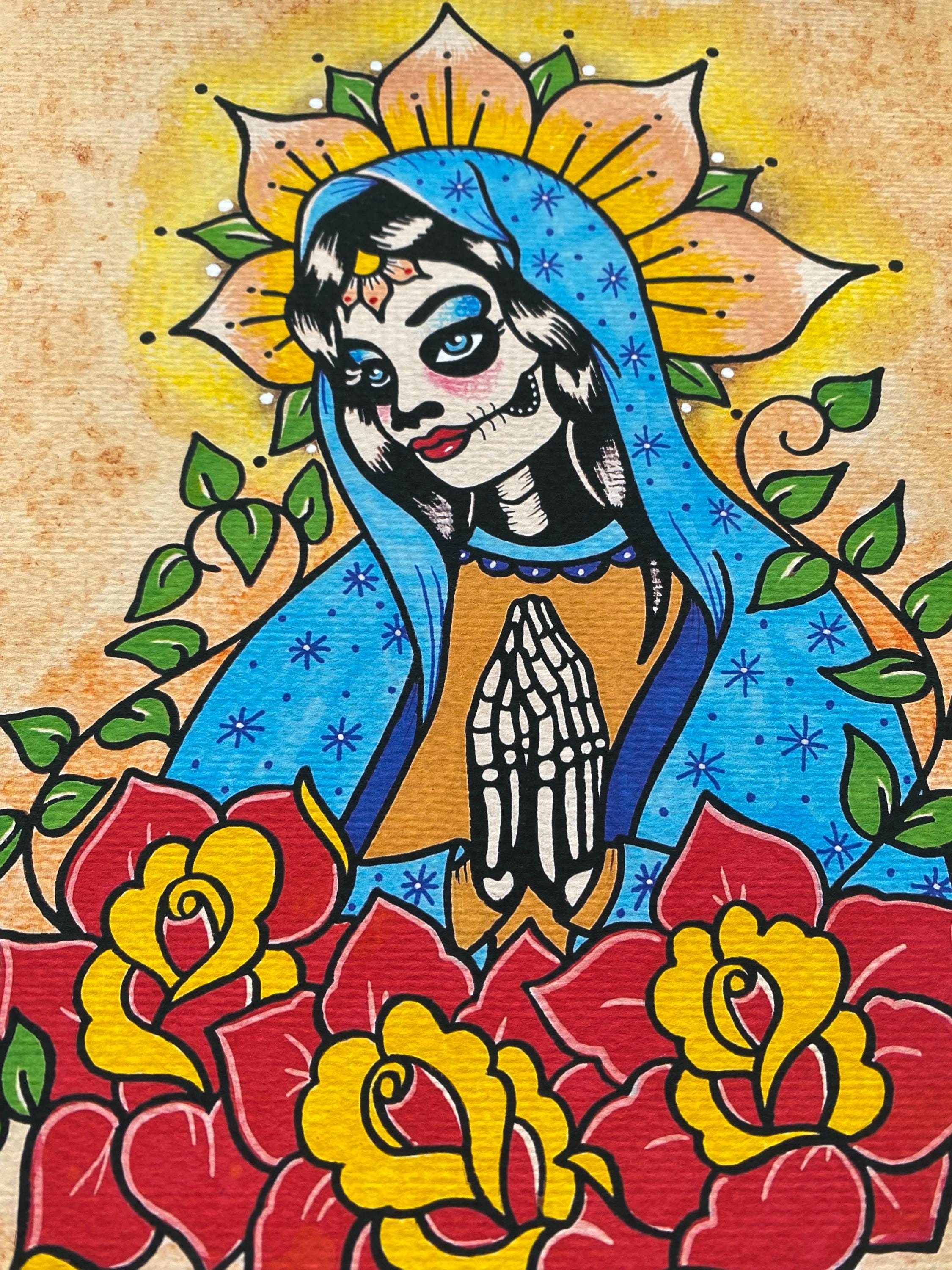 This print features the Virgin Mary surrounded by roses with a floral halo. Inspired by Day of the Dead and Traditional tattoo design.