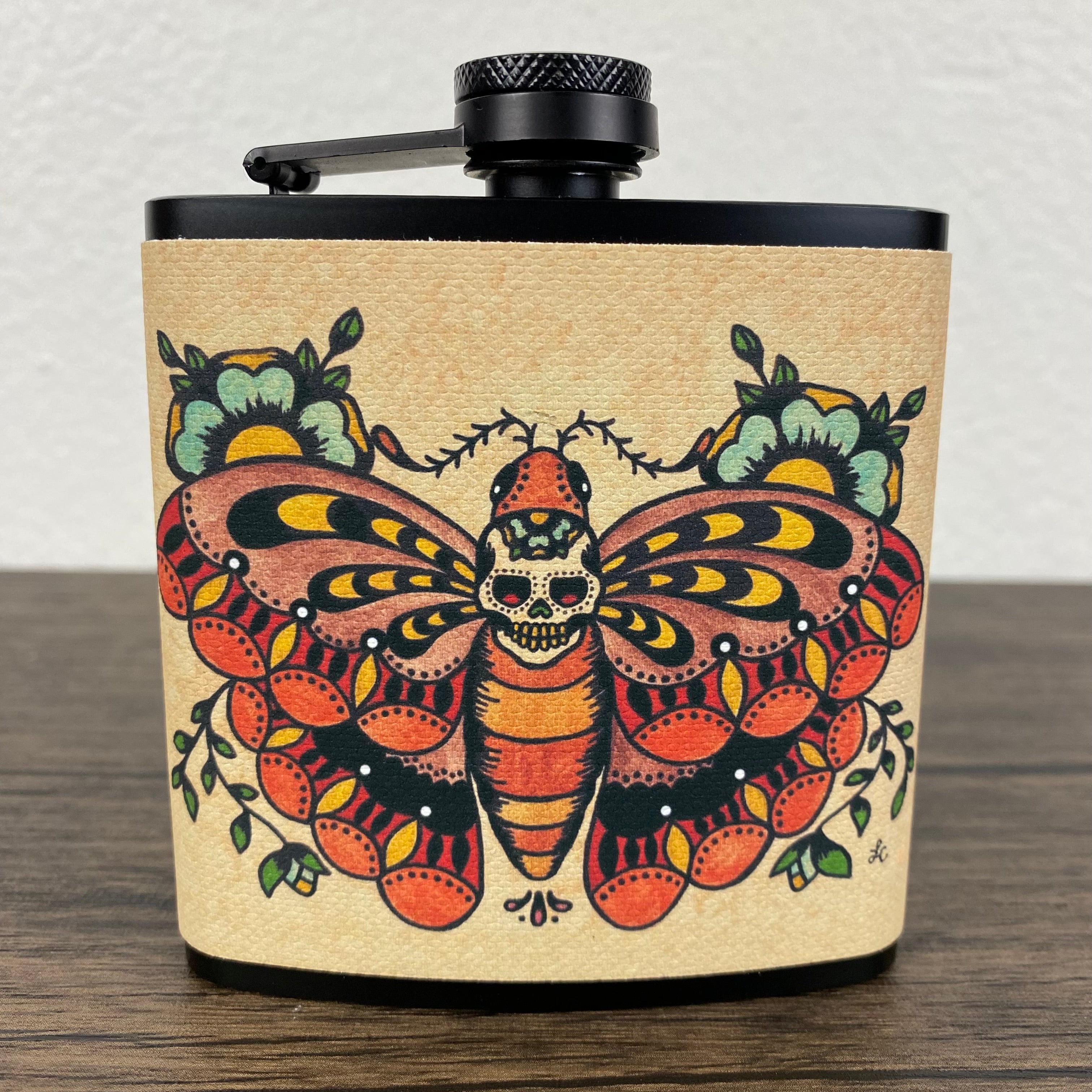 This death moth flask features my original artwork. The design is on a canvas wrap and sealed for water/liquid protection. This stainless steel flask holds 6 ounces and comes with a metal funnel.