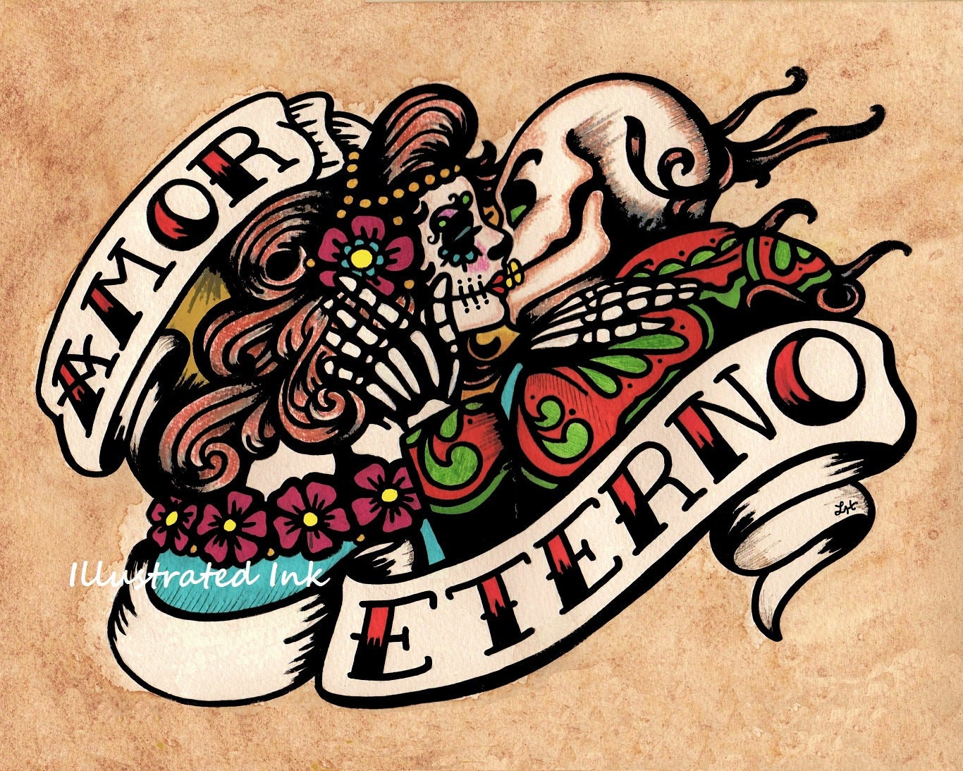"Amor Eterno" (eternal love) - This "Dia de los Muertos" skeleton couple is locked in a passionate embrace that reflects their forever love. This image would be a lovely addition to any "Day of the Dead" collection or the perfect gift for a wedding or romantic occasion!