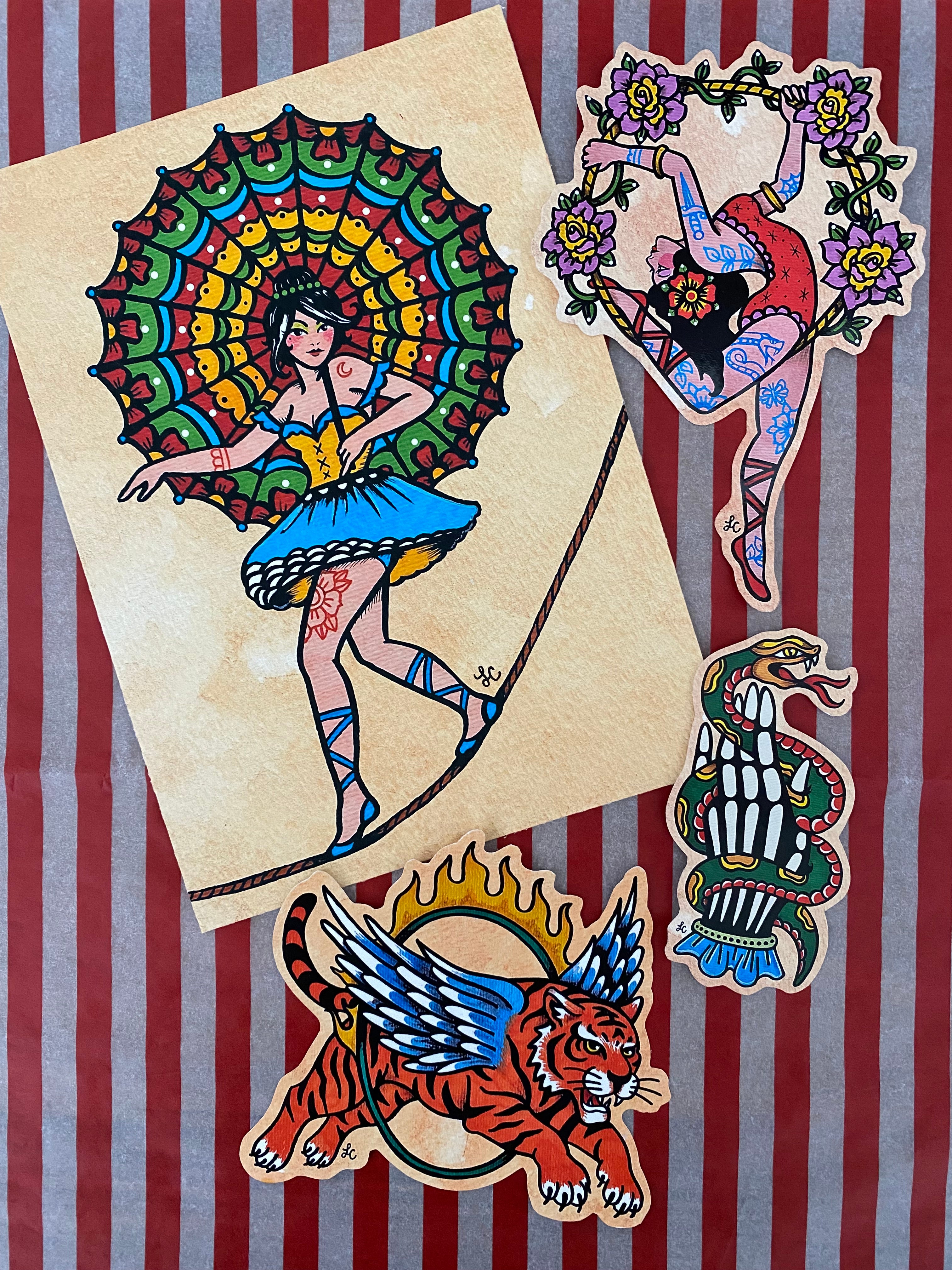 "Inked Arrivals" is a monthly subscription that will deliver my art directly to your mailbox! Each month's envelope will feature a new theme and include 3 stickers with a 5" x 7" print. All work is hand drawn, printed, and cut by me with love. Some of the designs will be exclusive only to my monthly subscribers. Your goodies will arrive in themed wrap each month in an envelope with postage stamps. My themes will be inspired by traditional tattoo design - upcoming themes will include: