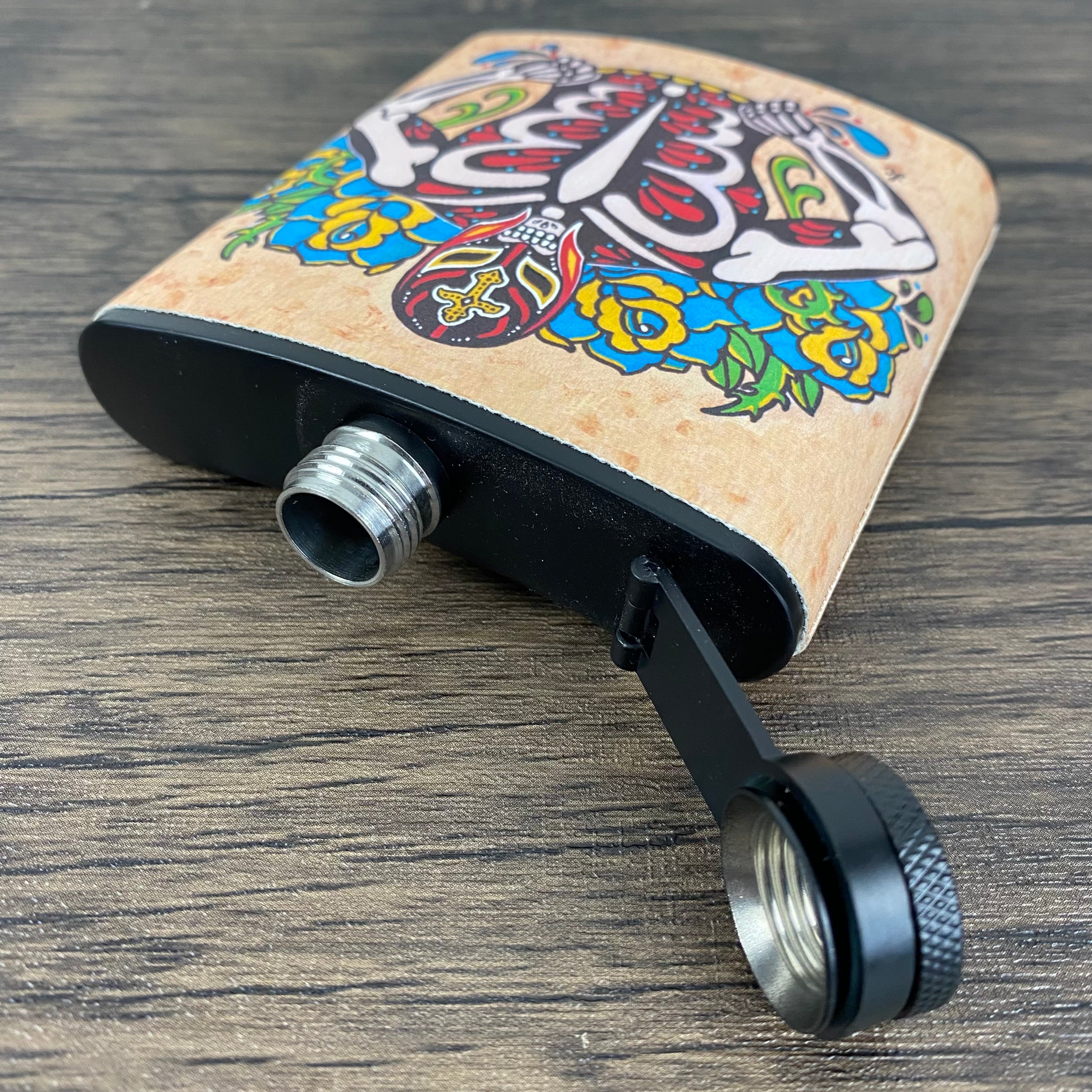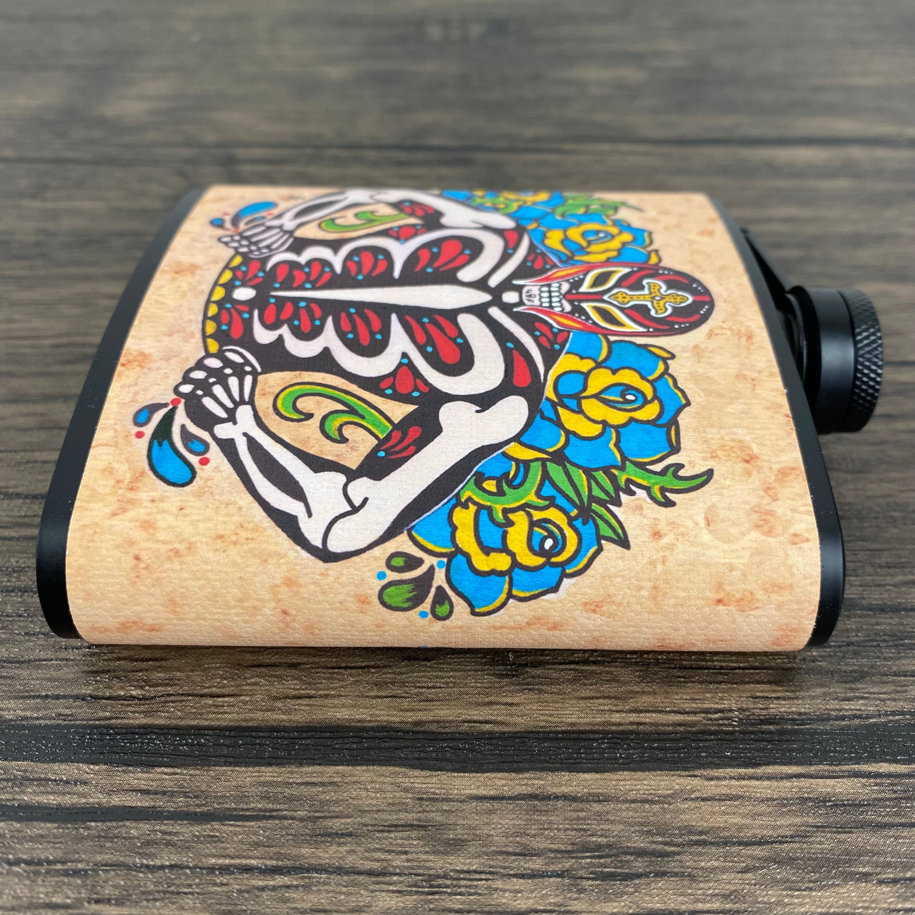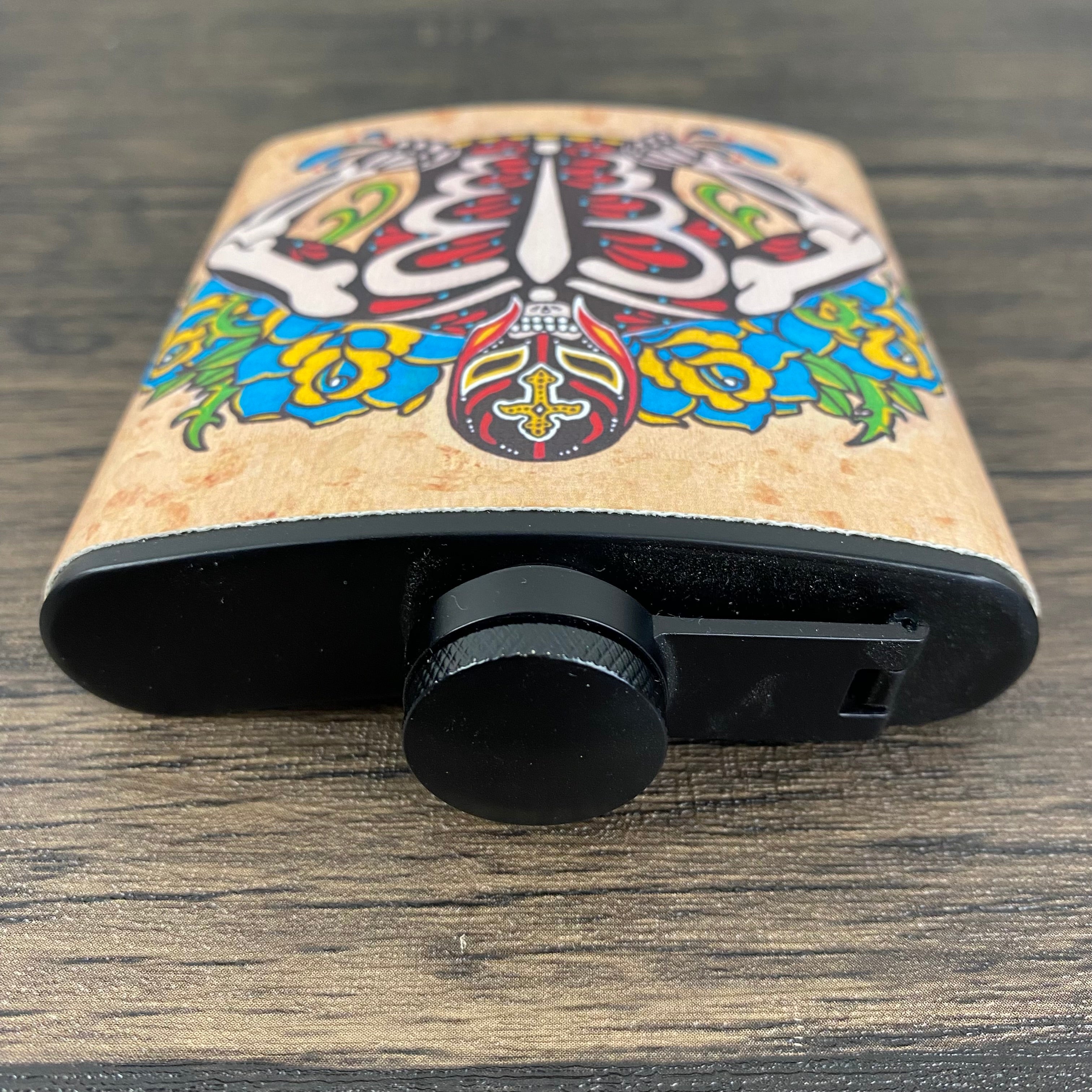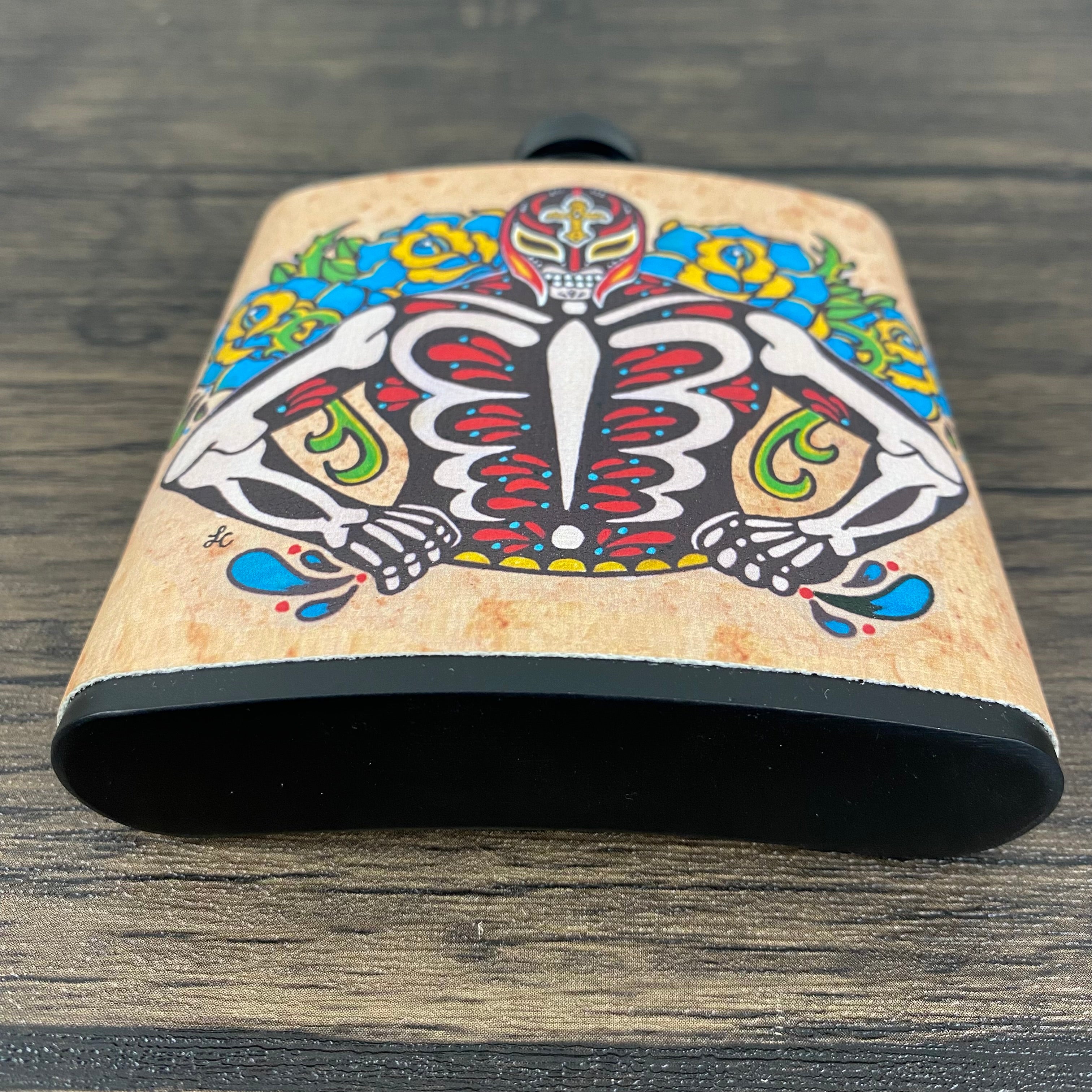 This Day of the Dead flask features my original artwork of a Luchador. The design is on a canvas wrap and sealed for water/liquid protection. This stainless steel flask holds 6 ounces and comes with a metal funnel.