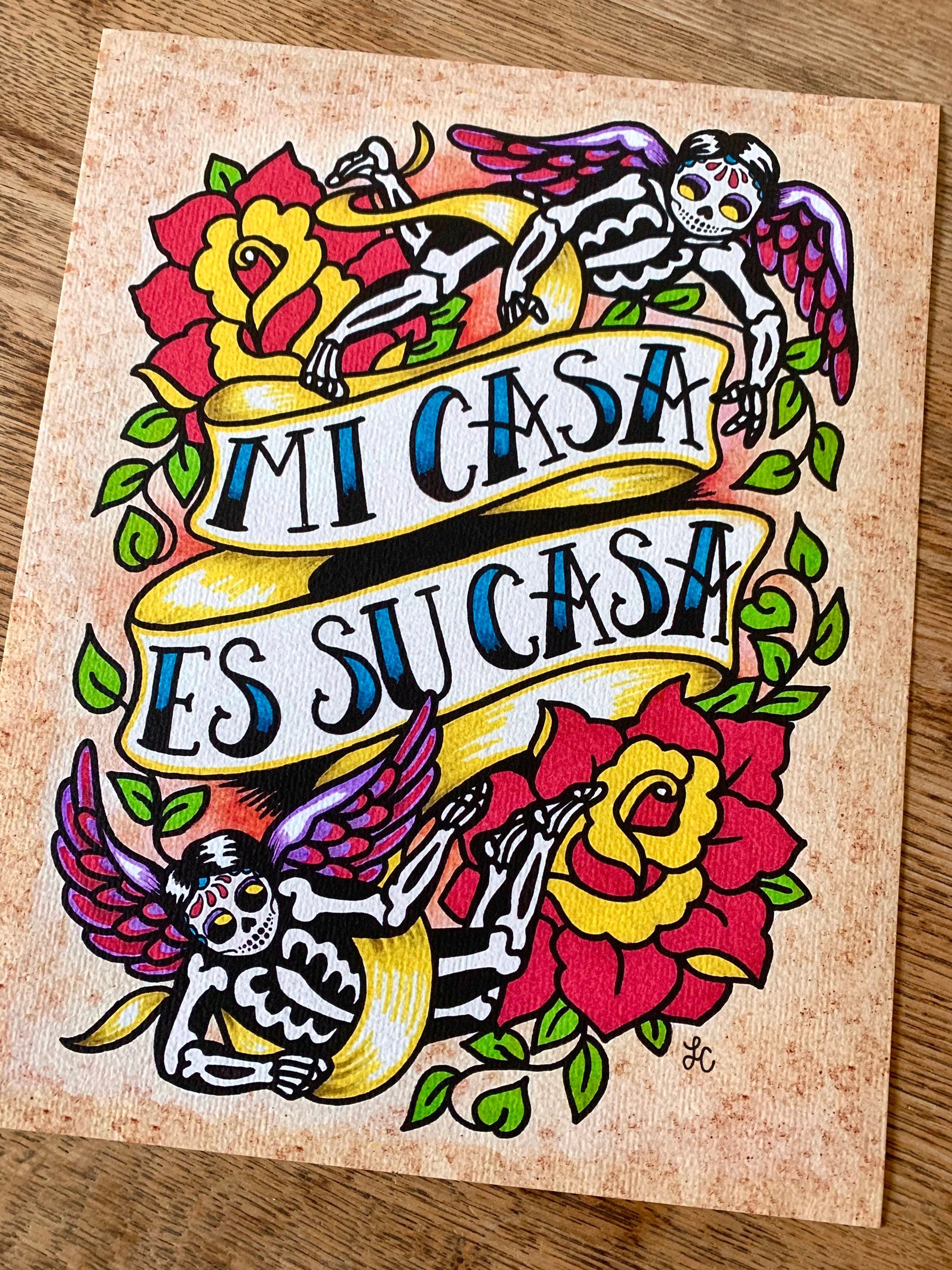 "Mi Casa Es Su Casa" (my house is your house) - I have always loved this welcoming Spanish saying! I decided to create my own Day of the Dead version, and it features two angelitos holding a banner with roses.