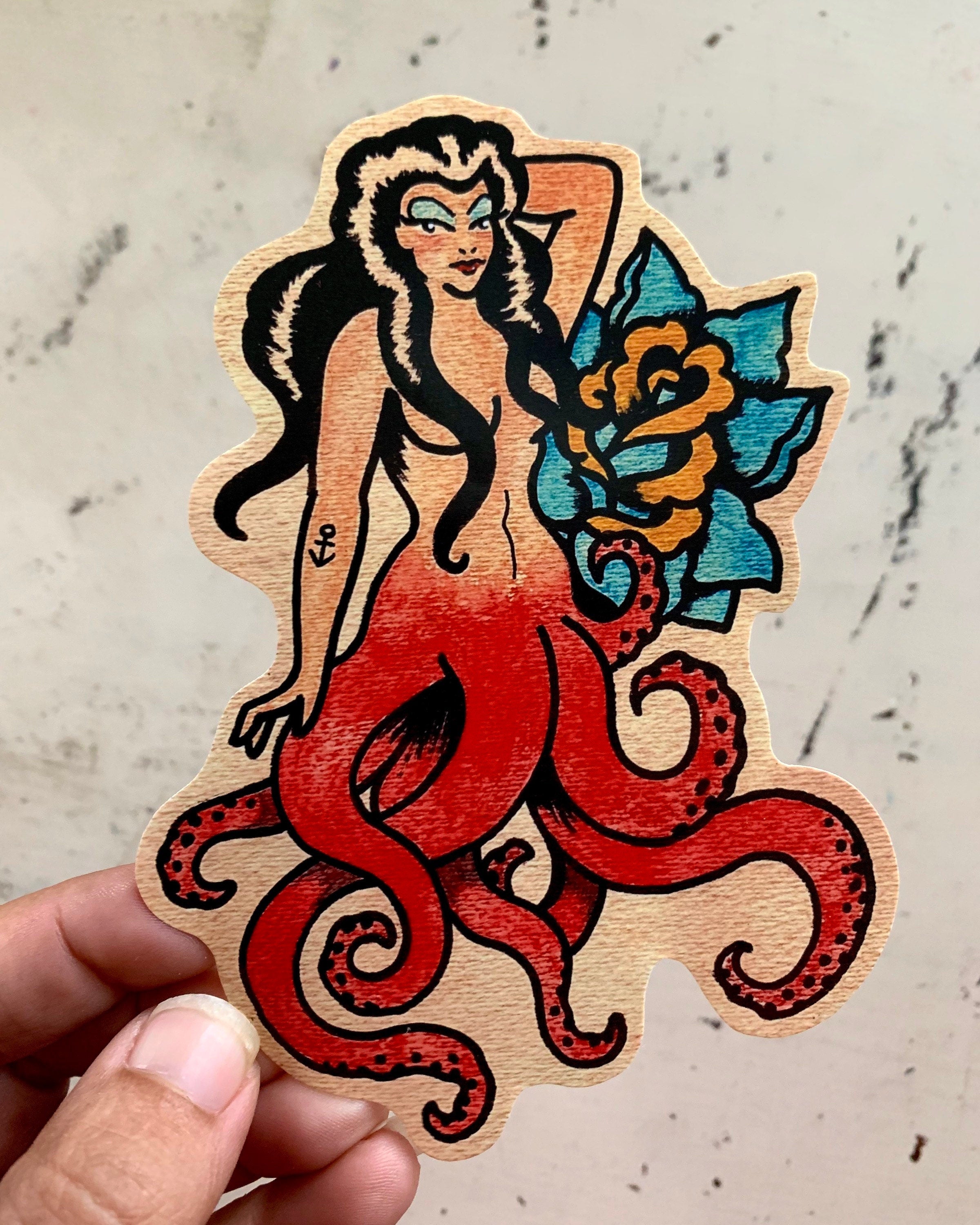 These sticker decals feature my original nautical pin-up art. Each measures about 5” tall. These are printed on vinyl paper and finished with a protective sealant. Each art sticker is hand cut and vibrant.