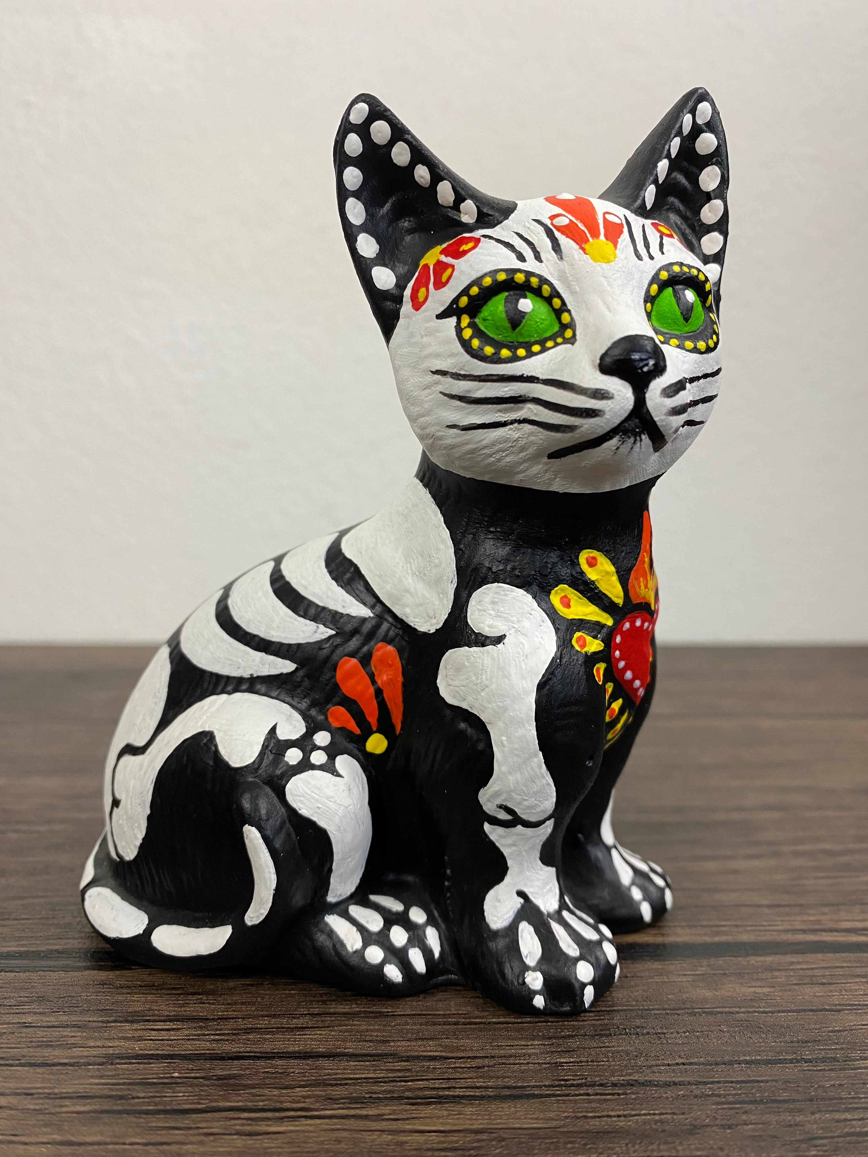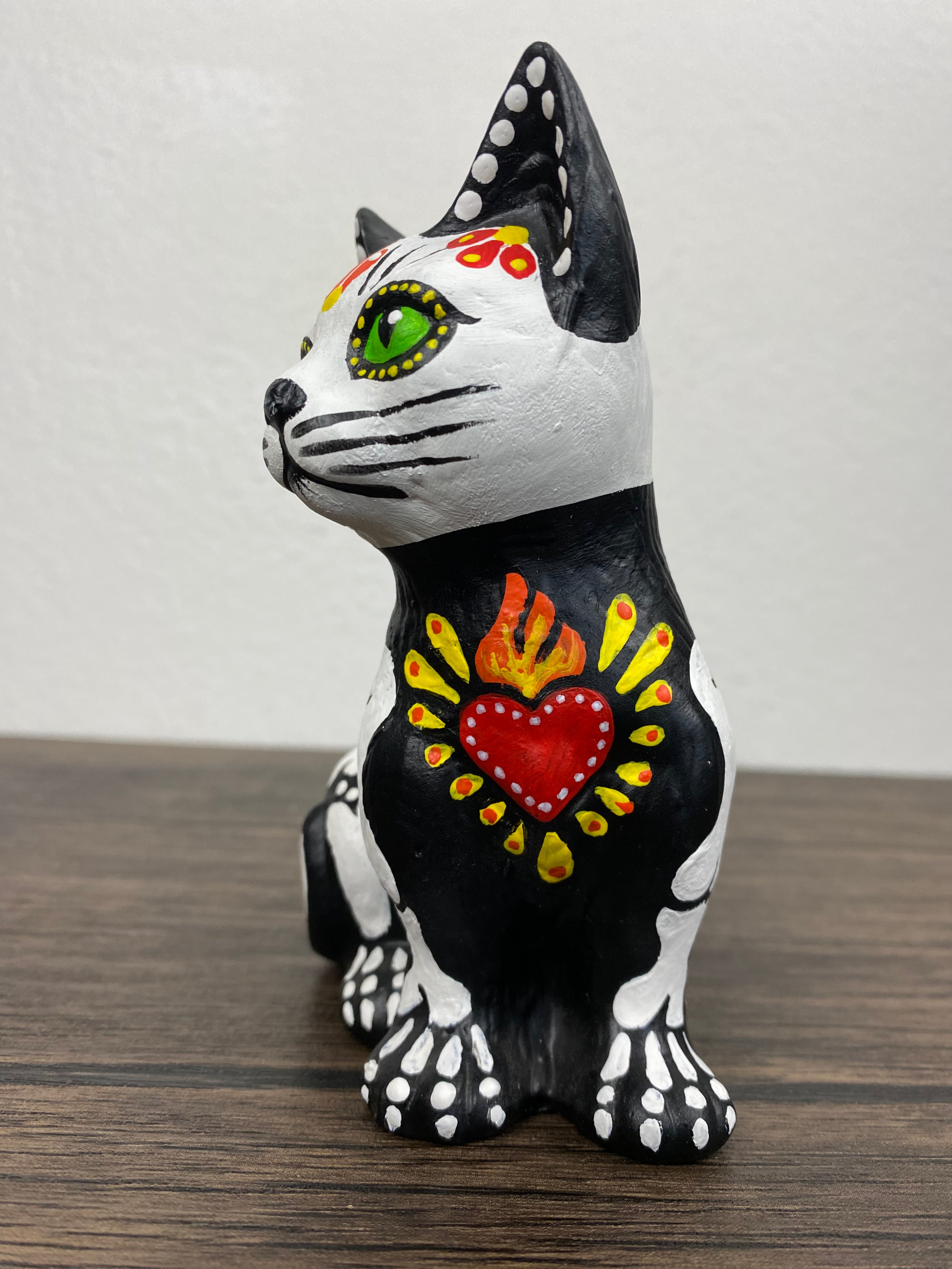 This sweet skele-kitty has been hand painted with delicate bones and features a sacred heart. I've chosen orange, red, and yellow for its main colors. The cat has vibrant green eyes. It measures 5” tall x 4.25” long x 2.5" wide. The piece has been matte sealed for protection and a lasting vibrancy. Signed on the bottom by the artist (me). This Day of the Dead statue would be lovely on an altar, and perfect for the remembrance of a beloved kitty.